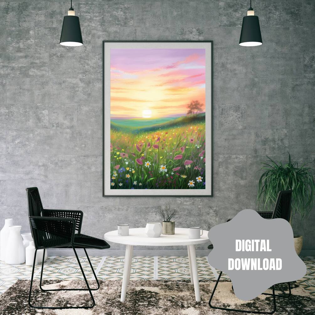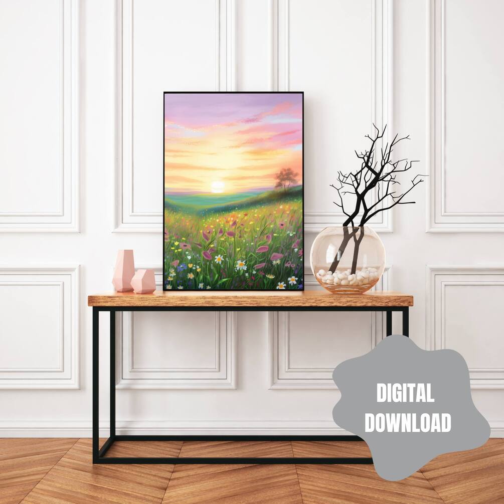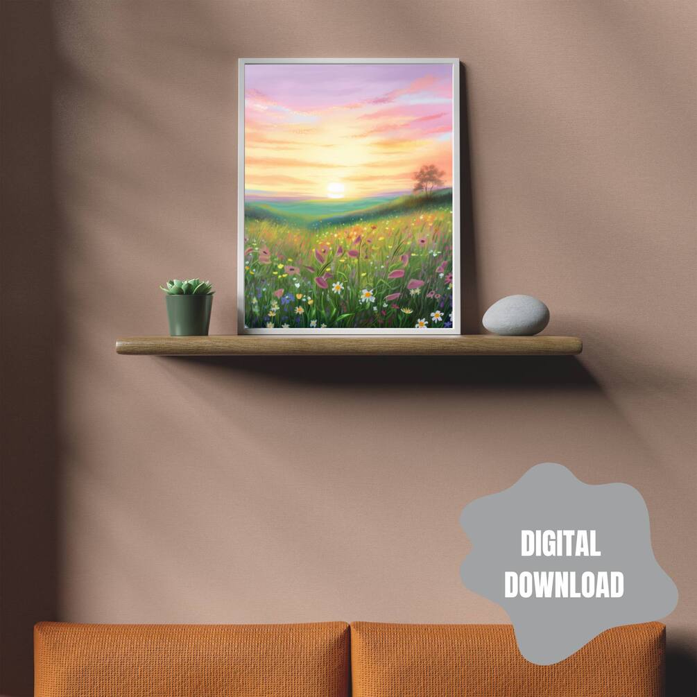 This beautiful wall art depicts a sunrise over a lush green meadow, the sun's rays are just beginning to peak over the horizon, casting a warm glow over the landscape, the meadow is filled with wildflowers of all colors, which add to the vibrant scene. This wall art would be a great addition to any home. It would look especially lovely in a living room or bedroom. The calming scene would help to create a relaxing and peaceful atmosphere.